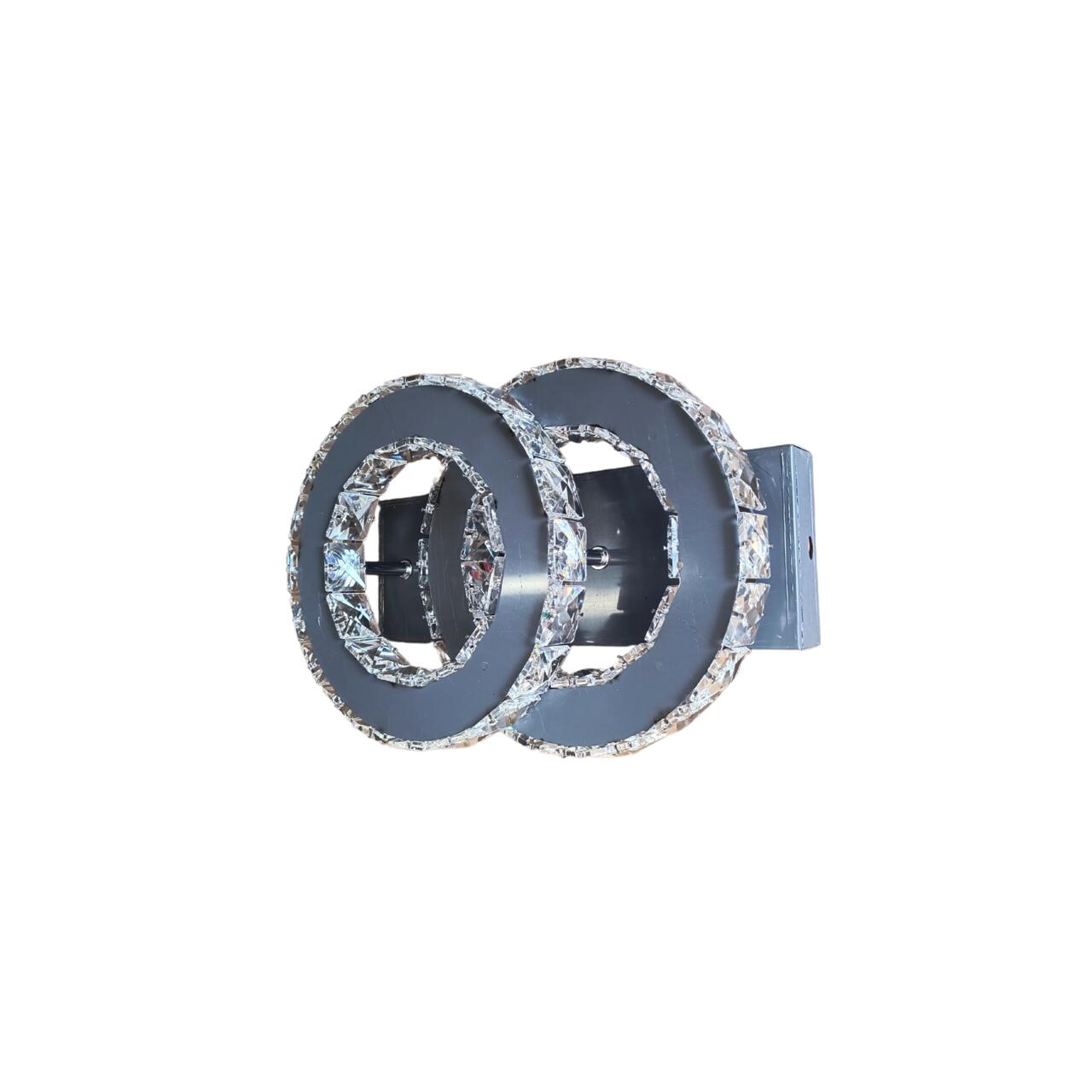Cristalele sunt montate pe marginea cercurilor, reflectând lumina pentru un efect vizual deosebit, iar oglinda integrată în bază și în interiorul cercurilor adaugă profunzime și stil. Montajul se face pe tavan, dimensiunile sunt 300x220mm, alimentare la 220-240V, iar protecția IP21 o face potrivită pentru orice spațiu interior.
