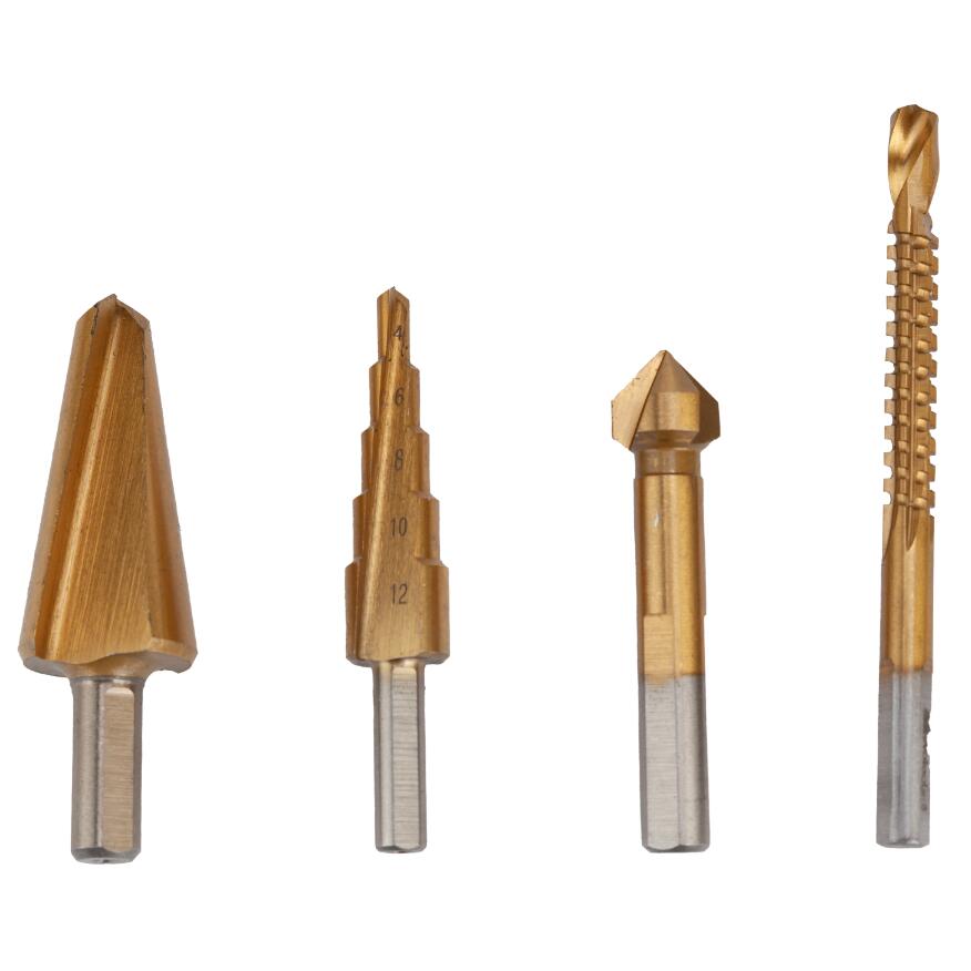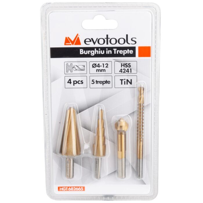 Este un instrument pentru găurit materiale dure. Face parte dintr-un set de 4 bucăți și este potrivit pentru diverse aplicații. Designul in trepte asigură precizie și ușurință in utilizare