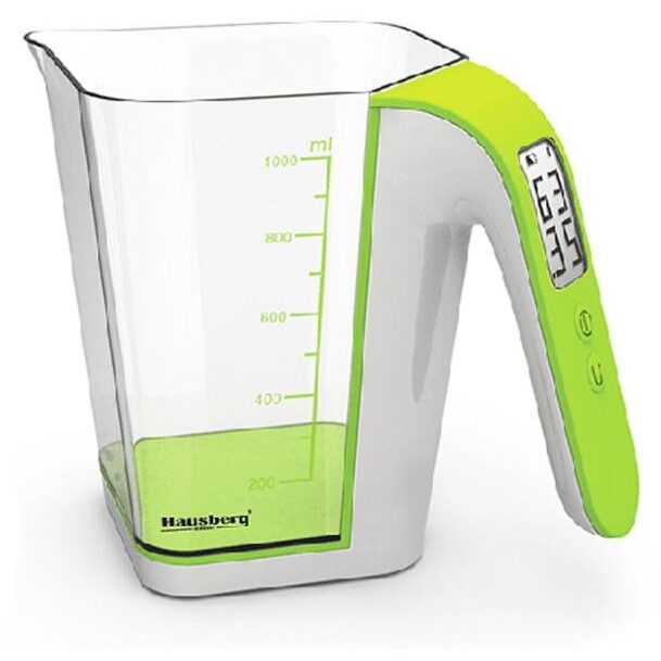 Cana gradata cu cantar Hausberg HB6014, LCD, Alb/Verde. Cana gradata cu cantar Hausberg va ajuta sa puneti cantitatea exacta de ingrediente necesare. Pentru persoanele care doresc sa aibe o dieta stricta aceasta poate fi solutia ideala.