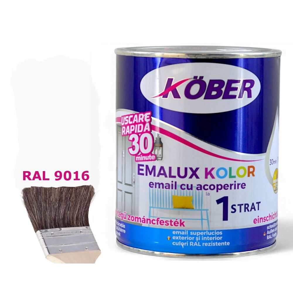Vopsea lucioasa, Kober Emalux Kolor, Alb Trafic, RAL 9016, acoperire 1 strat, uscare rapida 30 min, 0.75 litri