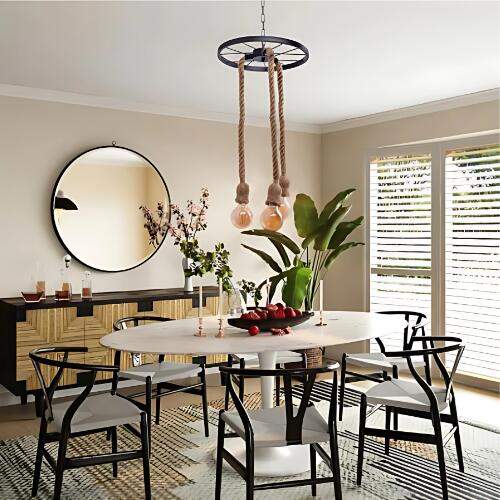 Lustra cu funie E27 este alegerea ideală pentru terase, foișoare sau orice spațiu exterior acoperit, aducând un aspect rustic și natural, perfect pentru un decor relaxant și primitor.