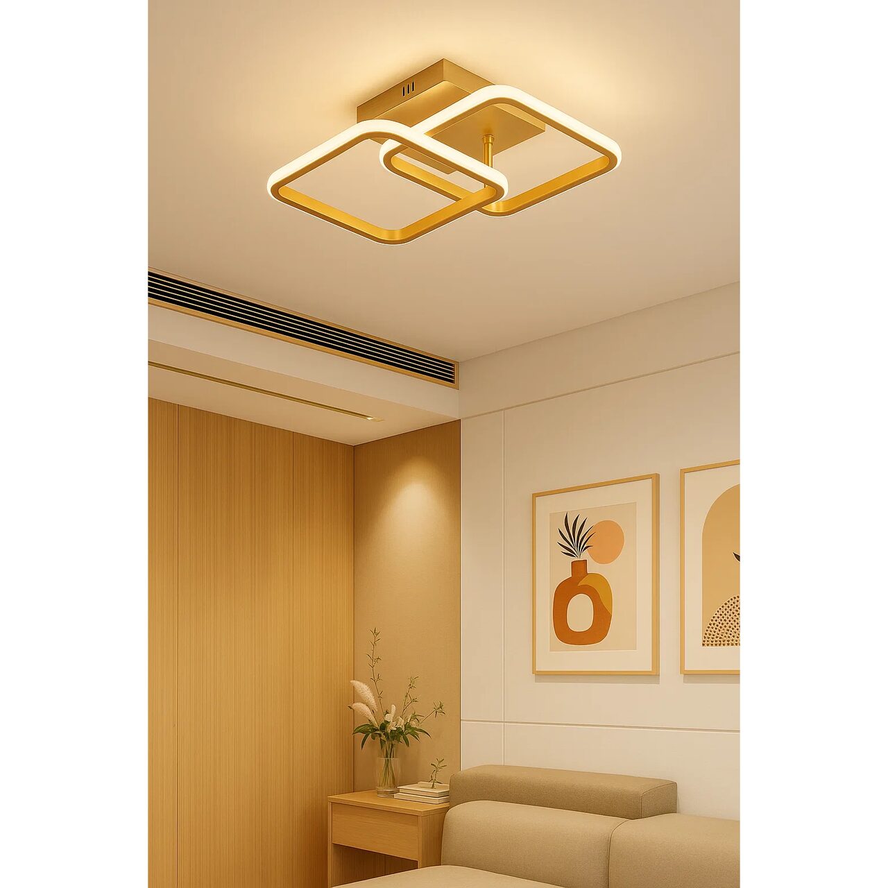 Această aplică LED decorativă are un design geometric, compus din două pătrate și o bază aurie, ideală pentru a aduce un plus de stil în orice încăpere. Cu o putere de 60W și flux luminos de 4200 lumeni, este potrivită pentru iluminatul principal în living, dormitor, hol sau birou.