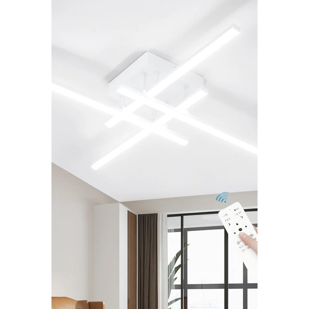 Lustră LED 64W, albă, cu 4 linii suprapuse, lumină reglabilă caldă-naturală-rece, intensitate ajustabilă prin telecomandă, design modern pentru tavan.