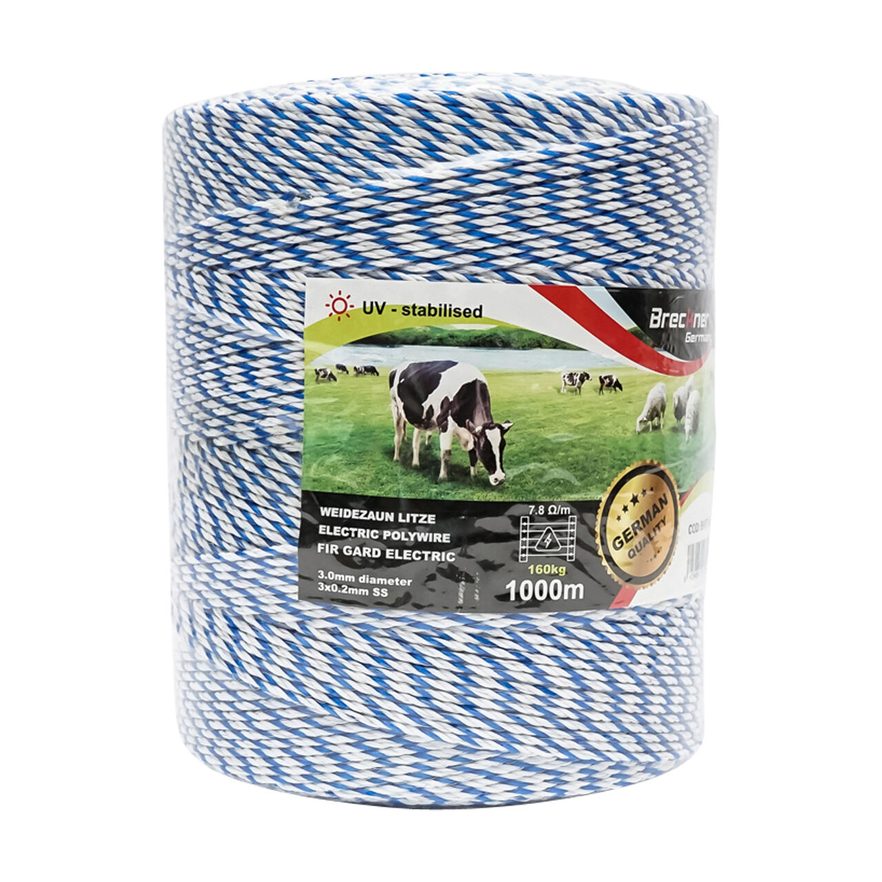 Rola fir alb-albastru fi 3 mm. 3x0.2mm. SS, 7,8 Ohm/metru, 1000 metri gard electric Breckner GermanyBrandBreckner GermanyRezistenta7.8 Ω/mRezistenta la ru...