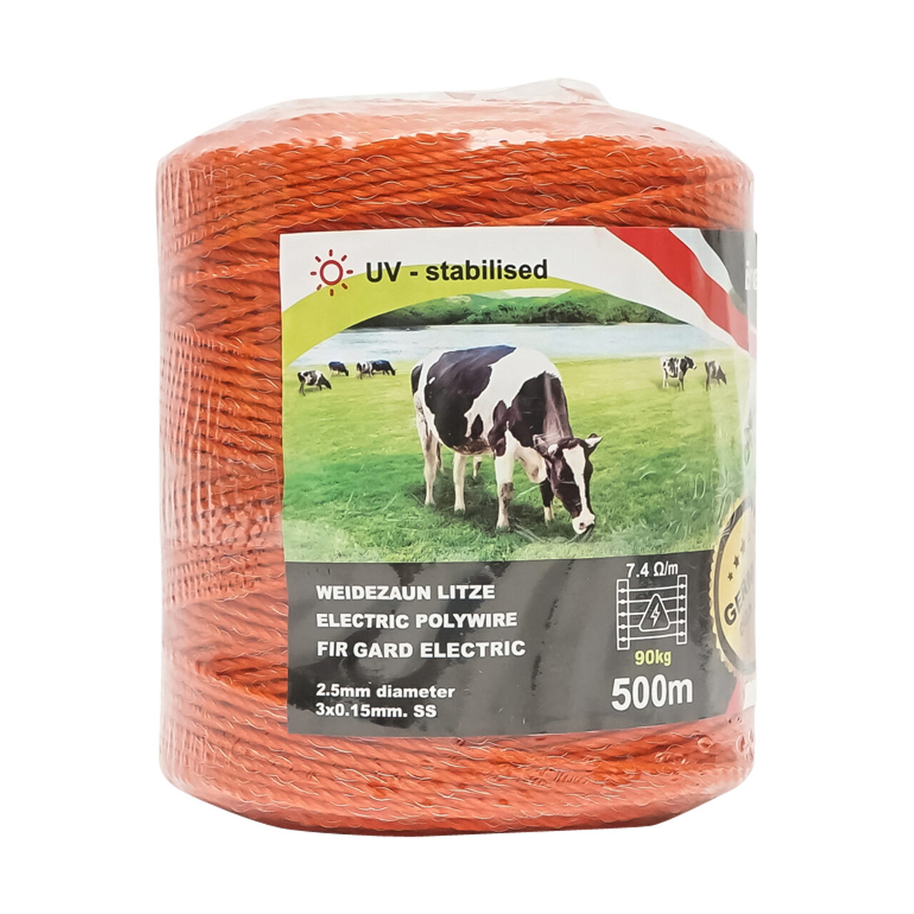 Rola fir portocaliu grosime fir 2,5 mm, 3 x 0.15 mm SS, 8 Ohm/m, 500 metri gard electric Breckner GermanyBrandBreckner GermanyRezistenta7.4 Ω/mRezistenta ...
